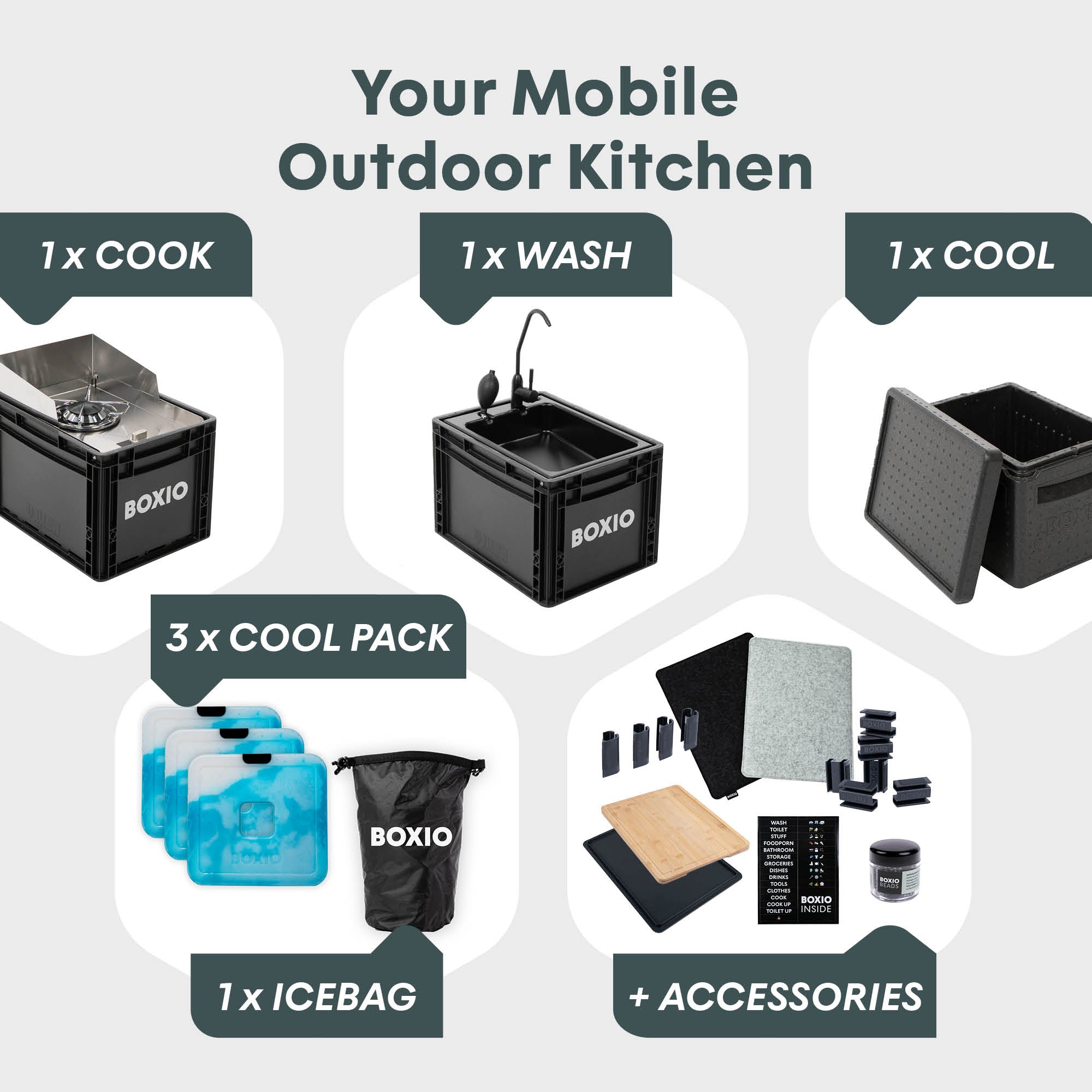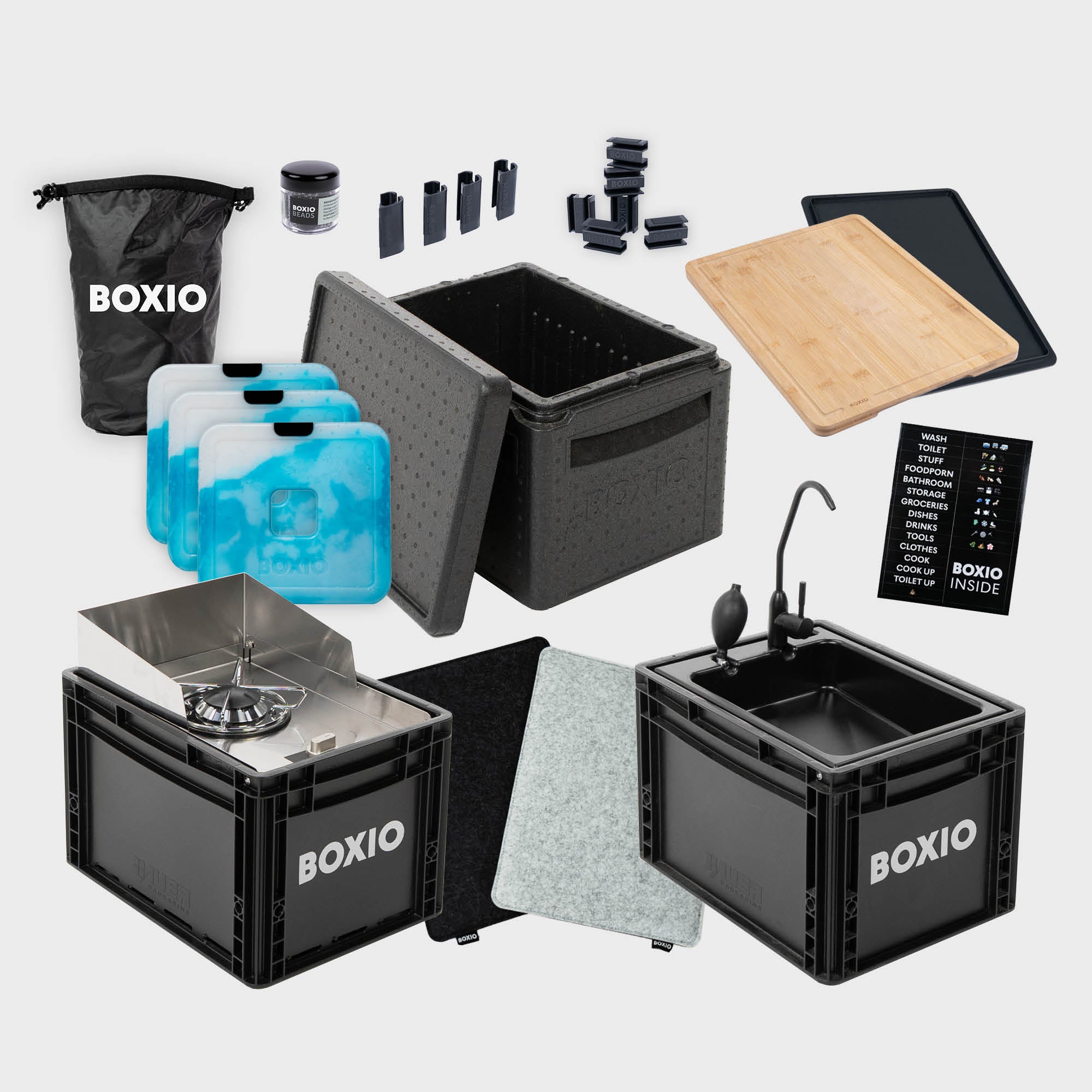 Praktische BOXIO-Waschanlage mit Zubehör: zwei schwarze Kisten, einem Schlauch und Reinigungsmitteln.Schwarze Kunststoffbox mit verschiedenen Reinigungsutensilien wie Tüchern und Flaschen.