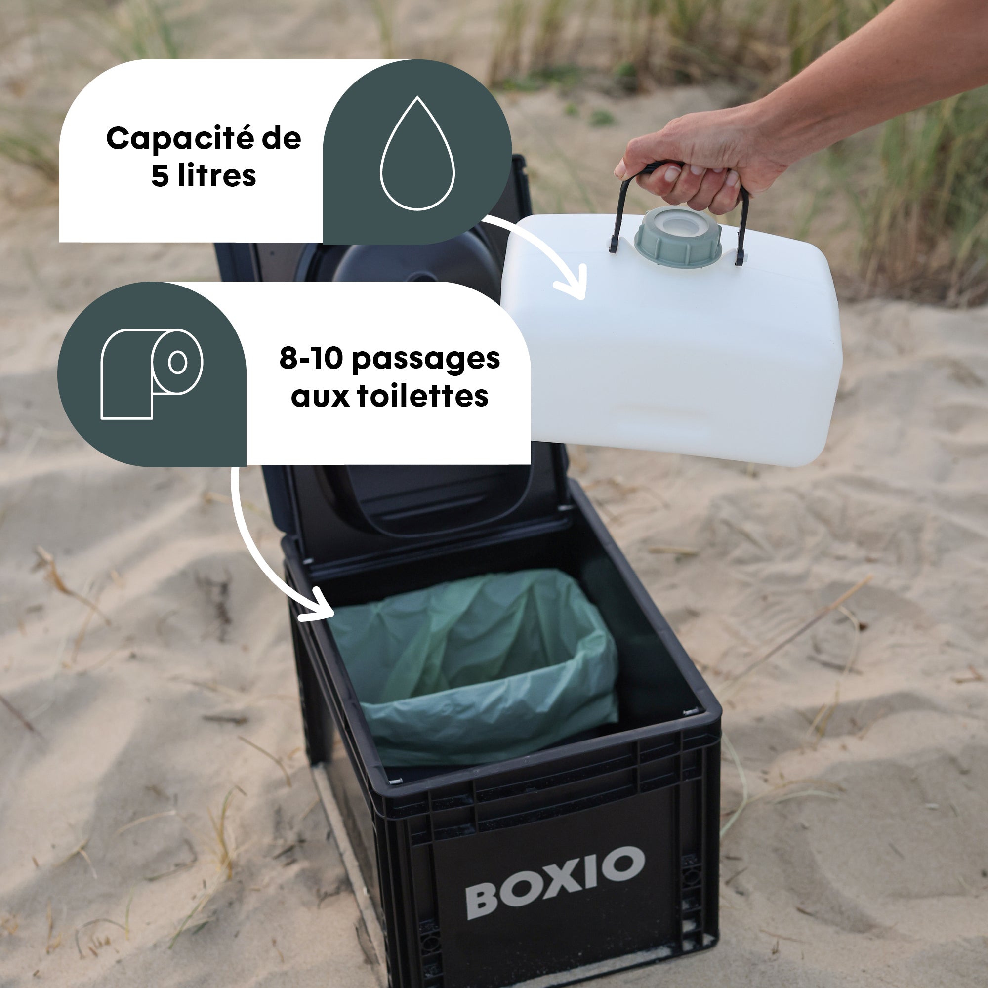 Les toilettes à compost BOXIO sont notre déclaration silencieuse pour un voyage intelligent et durable – développées avec passion, expérience et la ferme volonté de rendre le camping plus confortable et respectueux de l'environnement. Il est compact, mobile, ne pèse que 2,8 kg et, grâce à son format Eurobox (30 × 40 × 28 cm), s'intègre dans presque tous les coins de votre fourgon, bateau ou abri de jardin.